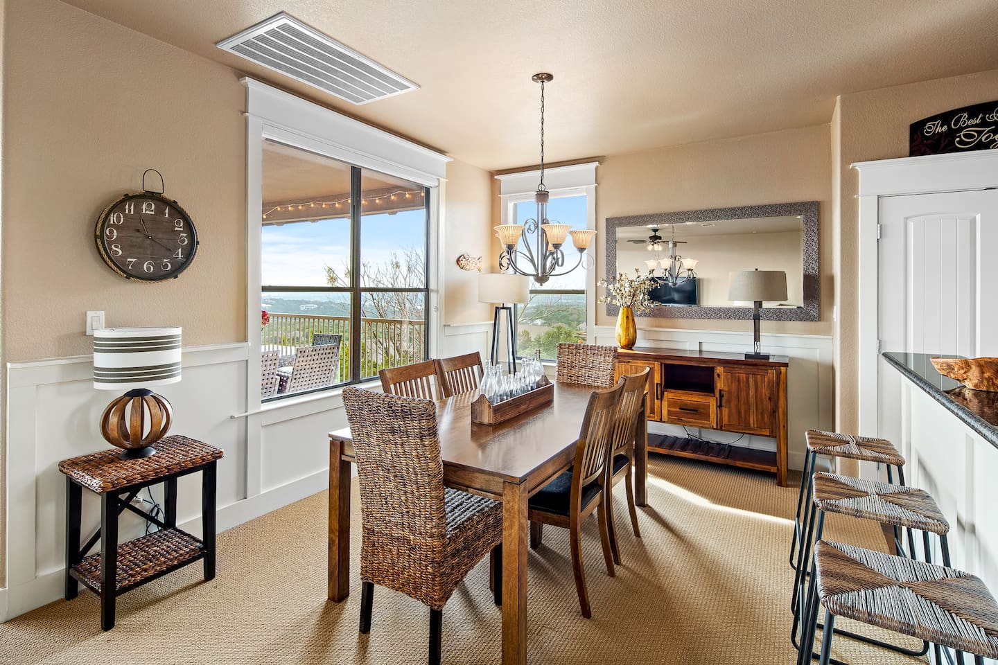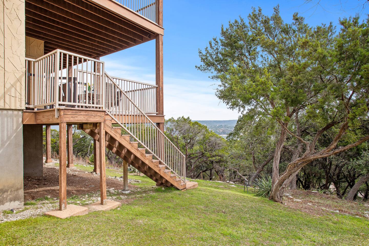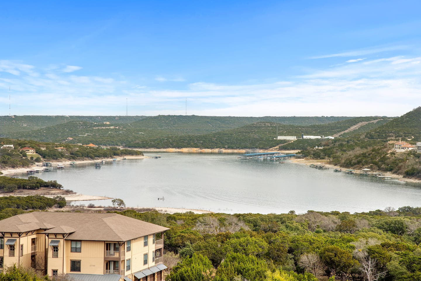 Awesome Hilltop Views! Perfect for a weekend escapes with stunning views of Lake Travis and the Hill Country. This 1,759 SF Home's master and second bedroom are on first level with third bedroom and living areas on second level plus three bathrooms. The Home sits on the Hilltop of the Hollows which is the highest point at 800 feet above the ground level. The Hollows offers amazing resort amenities; hiking trails, 2 pools, a spa pool and hot tub, Grill/bar, smokehouse grills, outdoor kitchen areas by the pools, playground, fitness center, marina. We have 4 Home on the Hilltop for your group gathering with the Smokehouse just across the street.