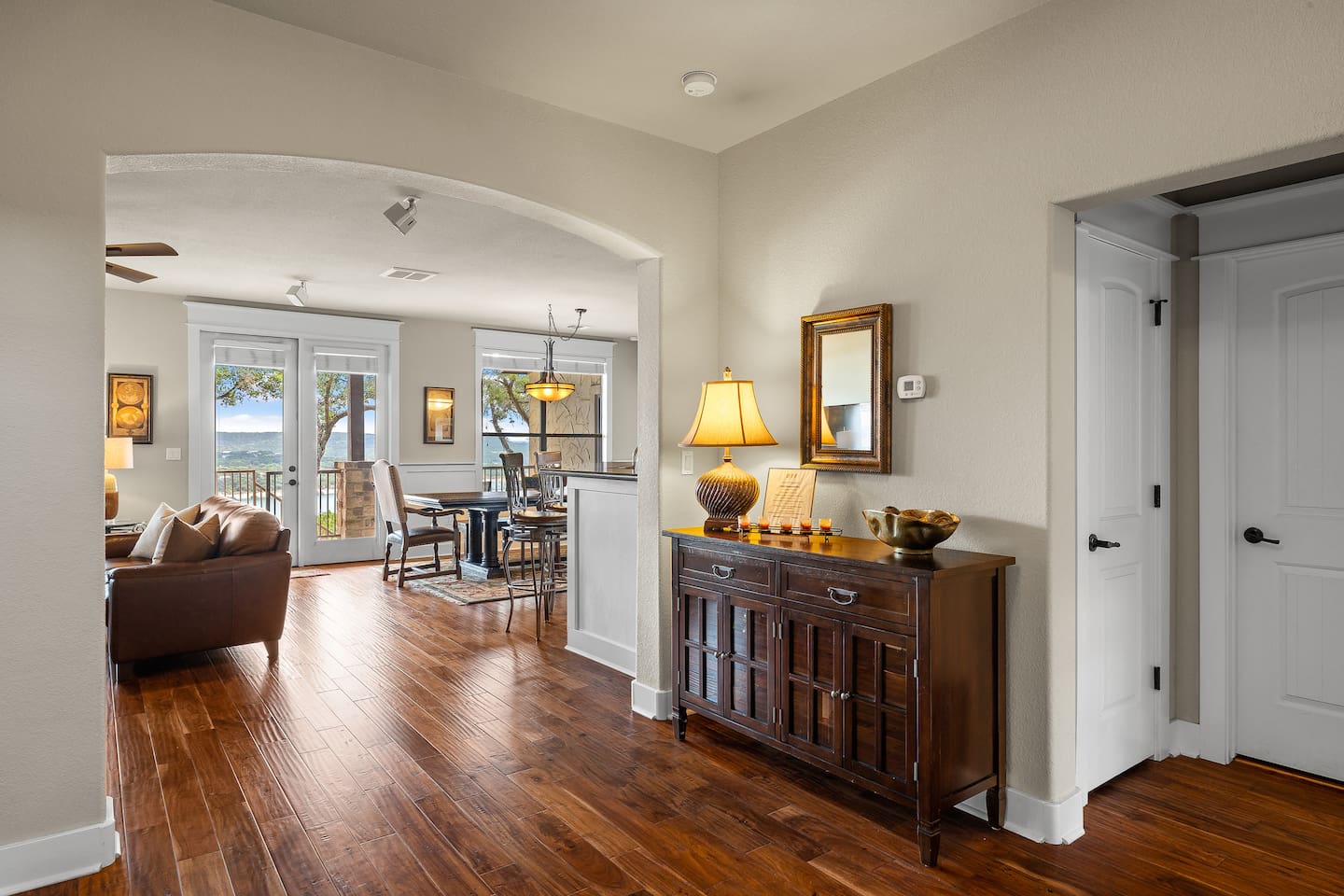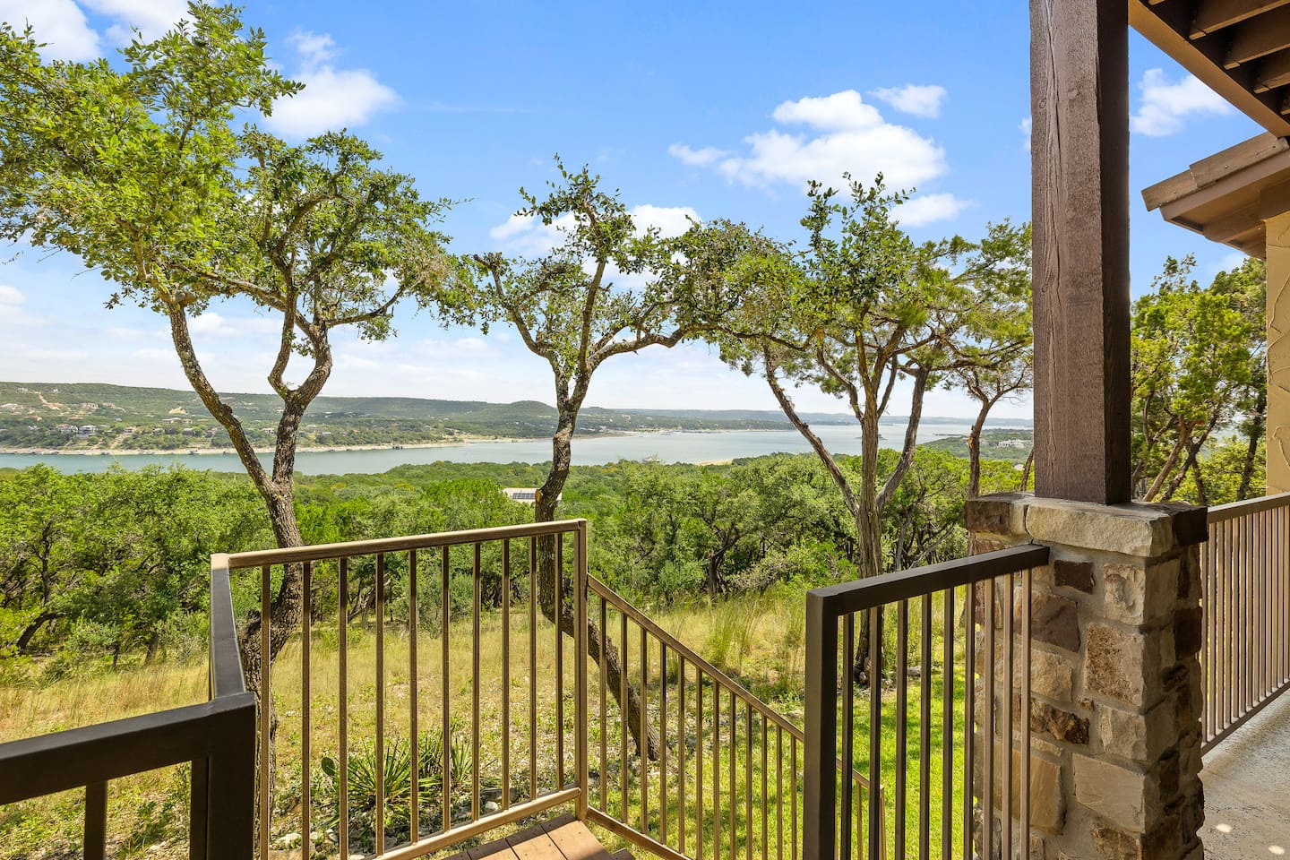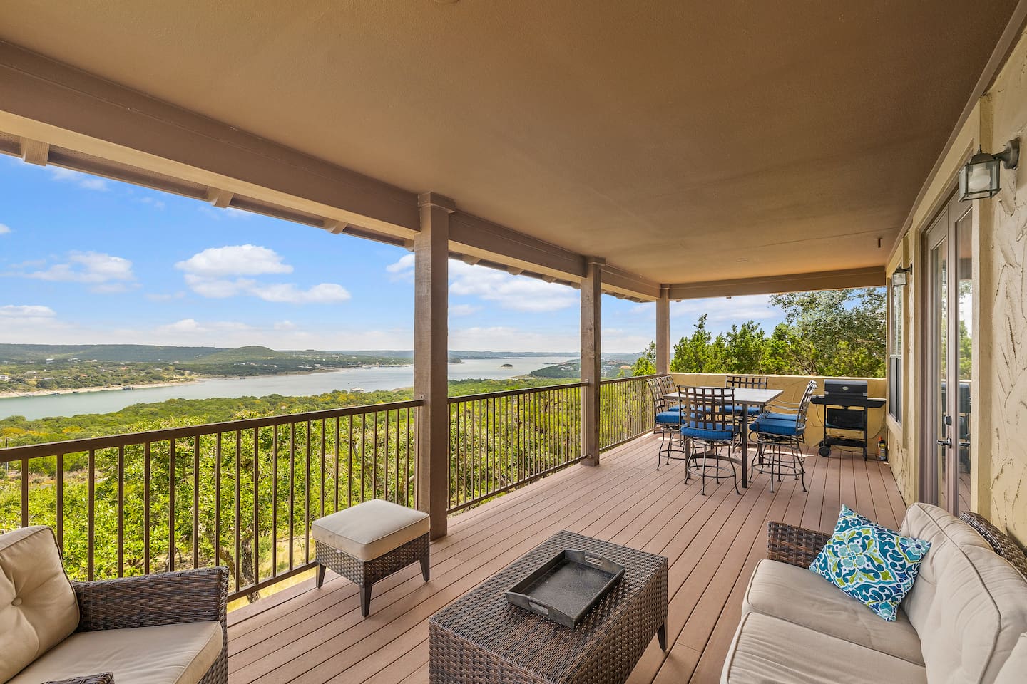 Relax on the two oversize decks that both include comfortable seating areas. The downstairs deck has a large grill and two dining tables for your dining needs while the upstairs has a grill, bar height dining table for six and a sofa and two lounge chairs so you are able to take in remarkable views of Lake Travis and the Hill Country from each area. It's the perfect place to entertain family and friends or just relax and take in the beautiful scenery.