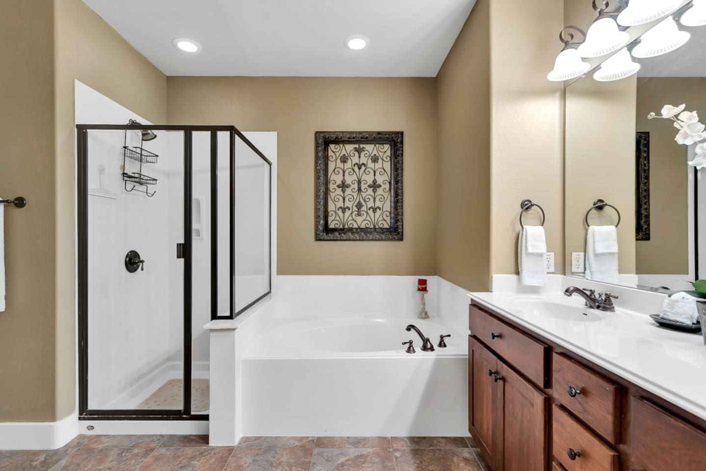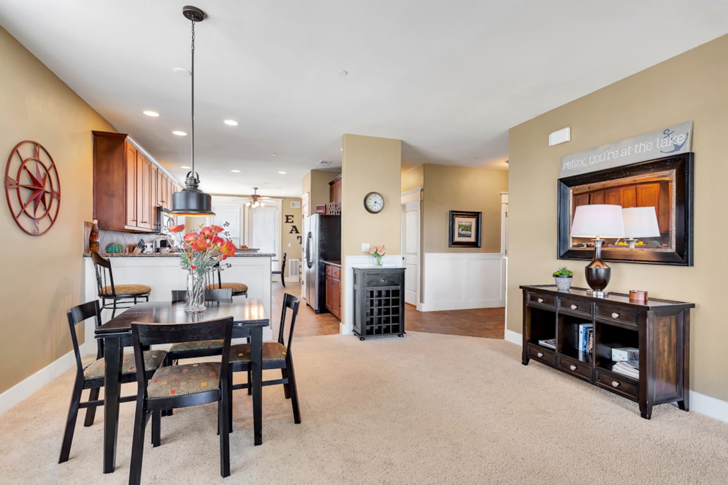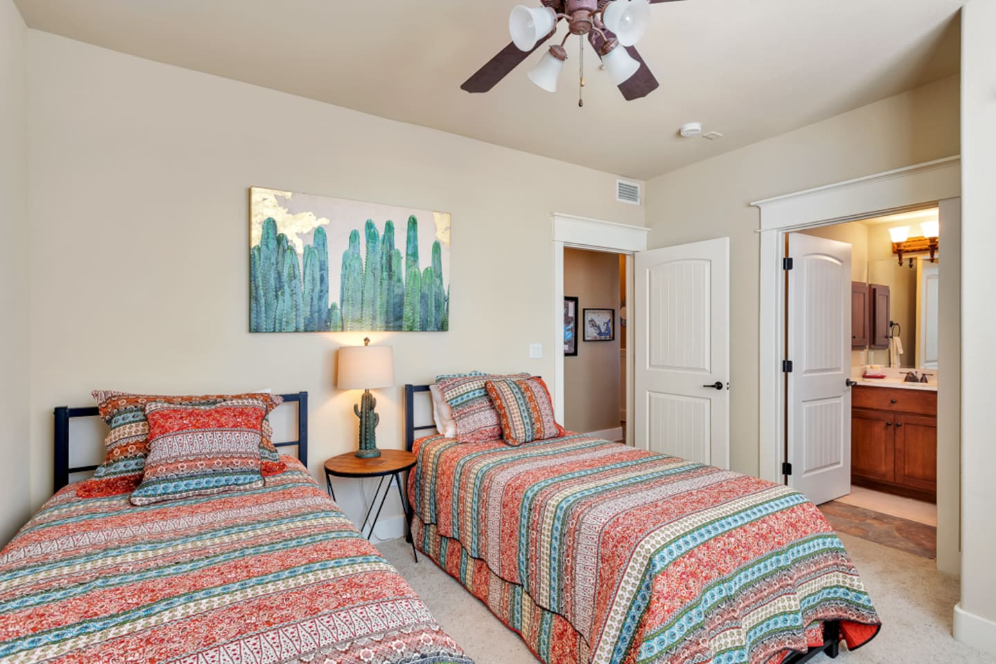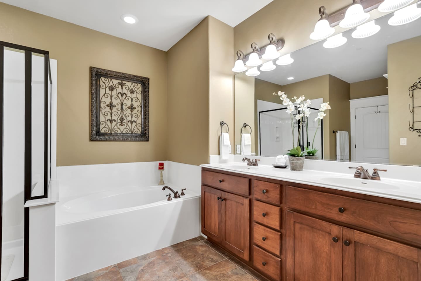This 3 bedroom/3 bath villa is very spacious at over 1700 sq. ft., with a fully equipped kitchen and two dining areas. Bedding includes a king, queen, two twins, and sleeps six. The master bedroom has a private bath with porch access and great lake views. The second guest bedroom also has a private bath.